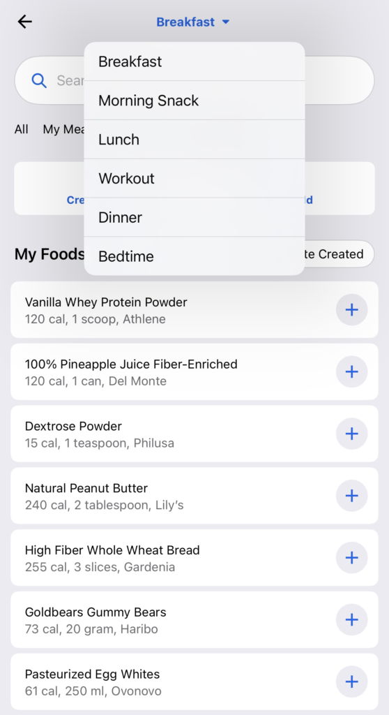 - Add Food: Tap “Add Food” under the specific meal (Breakfast, Lunch, etc.).